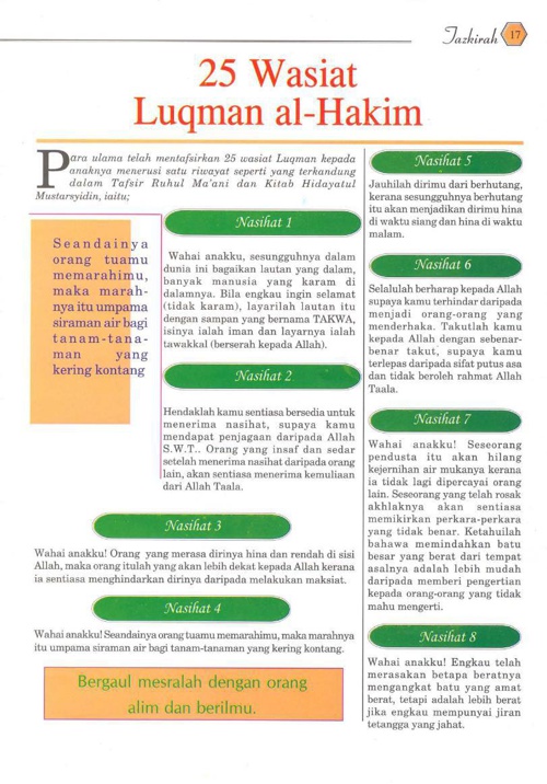 Allah swt mewahyukan kisah luqman al hakim alias luqman yang bijaksana kepada nabi muhammad saw, yang diabadikan dalam surat luqman. Luqman adalah hamba allah swt. Ia tidak menerima kenabian, tetapi menjadi seorang ayah pilihan allah swt. Dan barang siapa bersyukur (kepada allah), maka sesungguhnya dia bersyukur untuk dirinya sendiri; Sekiranya kamu di dalam solat, jagalah hatimu, sekiranya kamu makan, jagalah kerongkongmu, sekiranya kamu berada di rumah orang lain, jagalah keduamatamu dan sekiranya kamu berada di kalangan manusia, jagalah. Rujuk buku teks m/s 53 surah luqman : Dan barang siapa tidak bersyukur (kufur), maka sesungguhnya allah mahakaya lagi maha terpuji. Powerpoint presentation nasihat luqman al hakim kepada anaknya dunia ini ibarat lautan dalam. Jangan berteman orang bersifat talam dua muka. €150th.* mar 5, 2002 in kota bharu, kelantan, malaysia. Muhammad asyraf bin khairu anuar (g11'15) credit to : 272 likes · 1 talking about this. Jika menurutmu itu baik maka lanjutkanlah tapi jika menurutmu itu.