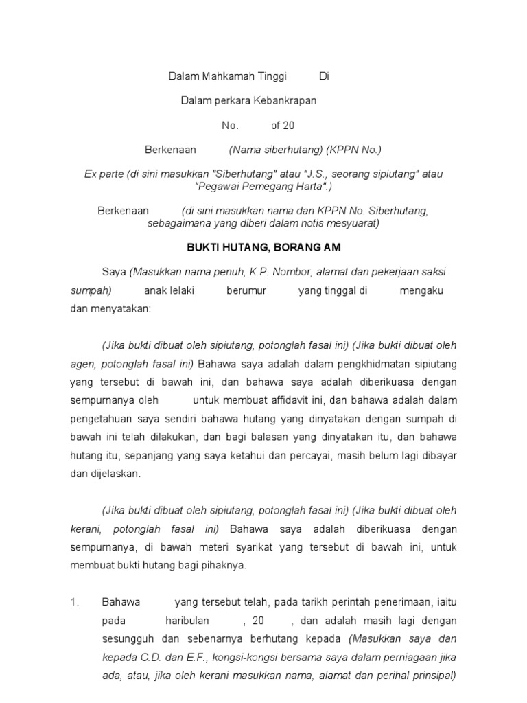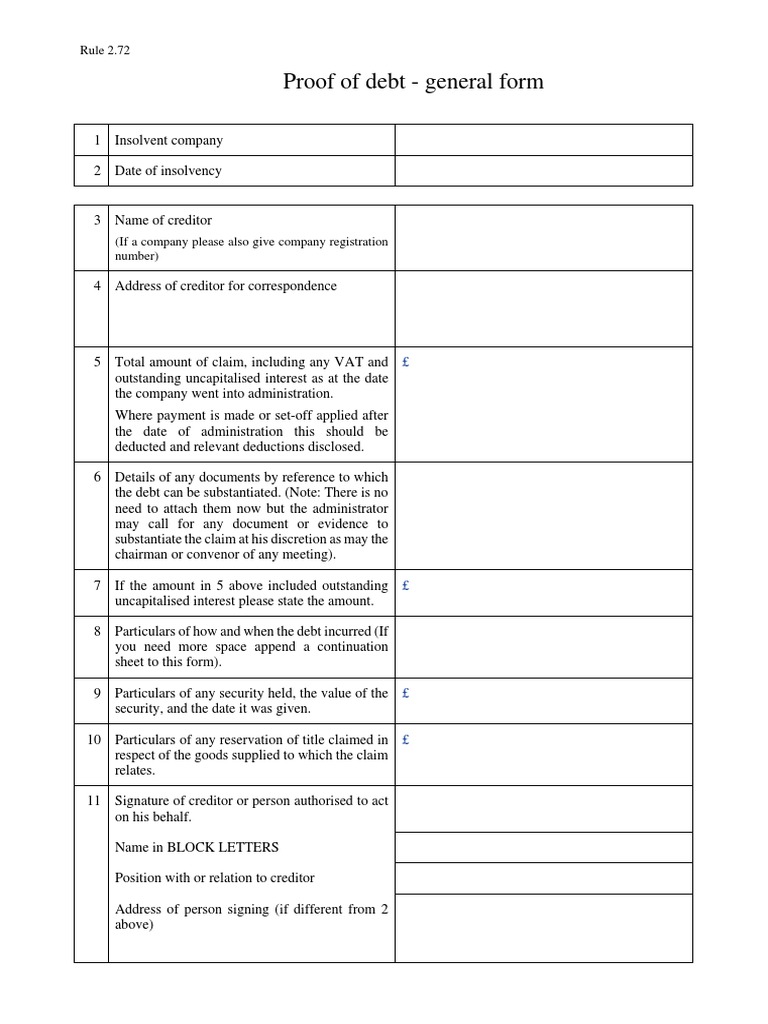 A writing by a creditor that contains a demand for payment of a debt and an intention to hold the debtor s bankruptcy estate law dictionary. A bankruptcy proceeding can also be brought against a minor i was declare bankrupt some 20 years ago without my knowledge when i was a citizen of malaysia. A proof of debt may also contain claims in respect of different aspects of a debt arising from the same contract, for instance a claim for arrears and a claim for damages for future losses where a creditor requests a proof of debt form in writing, a proof of debt form should be sent to the creditor by post. Fill proof of debt general form malaysia: You must submit the form at the special administrators' office on the last business day before.